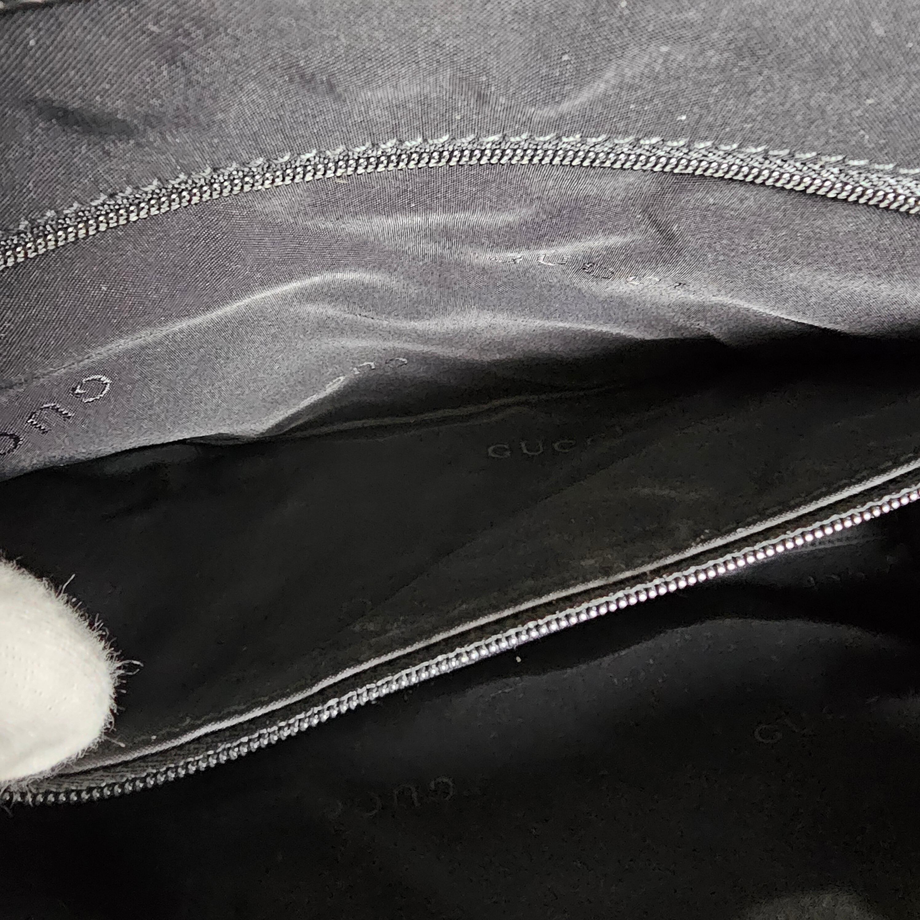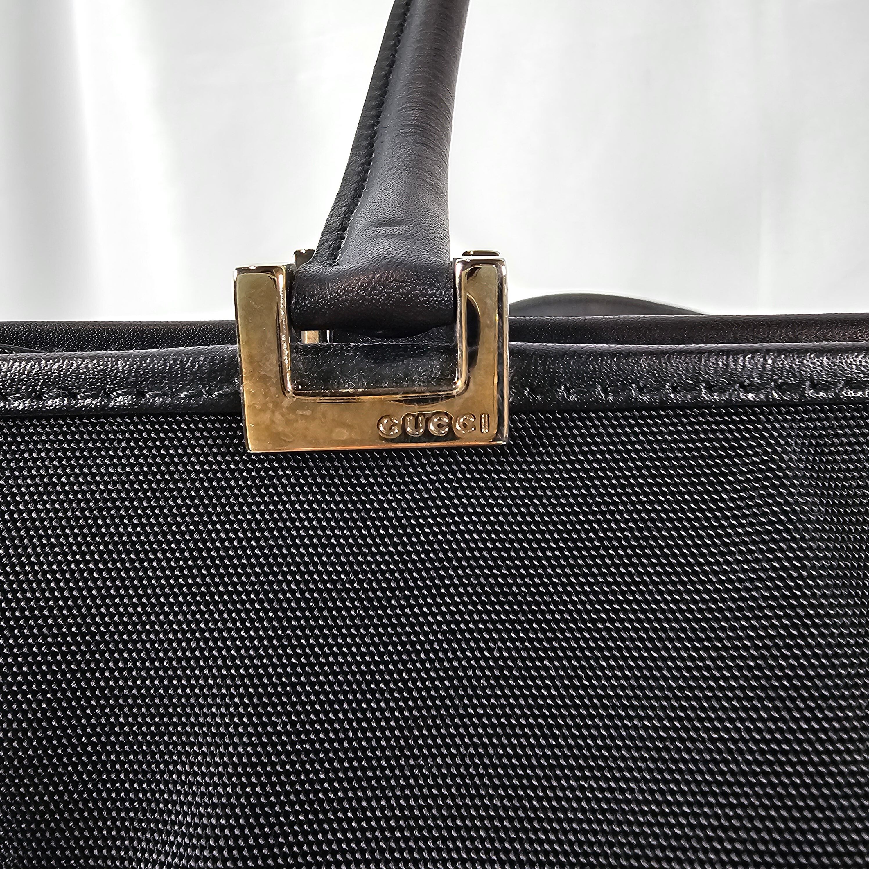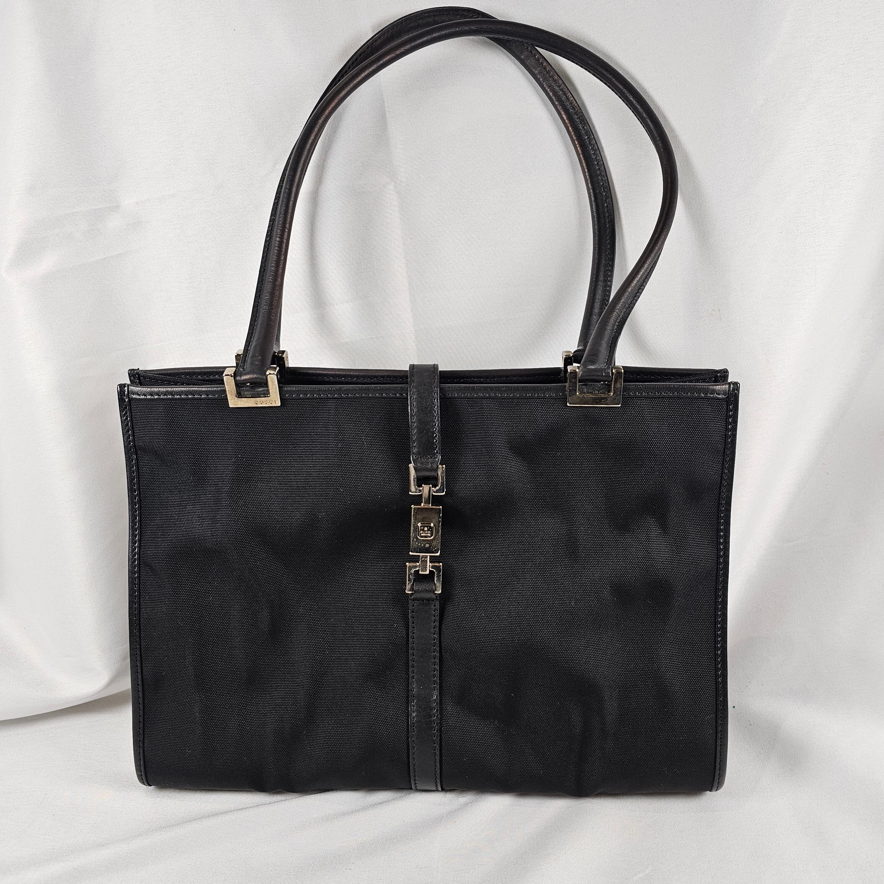 シックなブラックのキャンバス地(またはナイロン地)に、シルバーのジャッキー金具とレザーのトリミングが洗練された印象を与えます。A4サイズに近いサイズ感で、日常使いからビジネスシーンまで幅広く活躍するデザインです。グッチの中でも特に人気があり、時代を超えて愛されている定番モデルです。